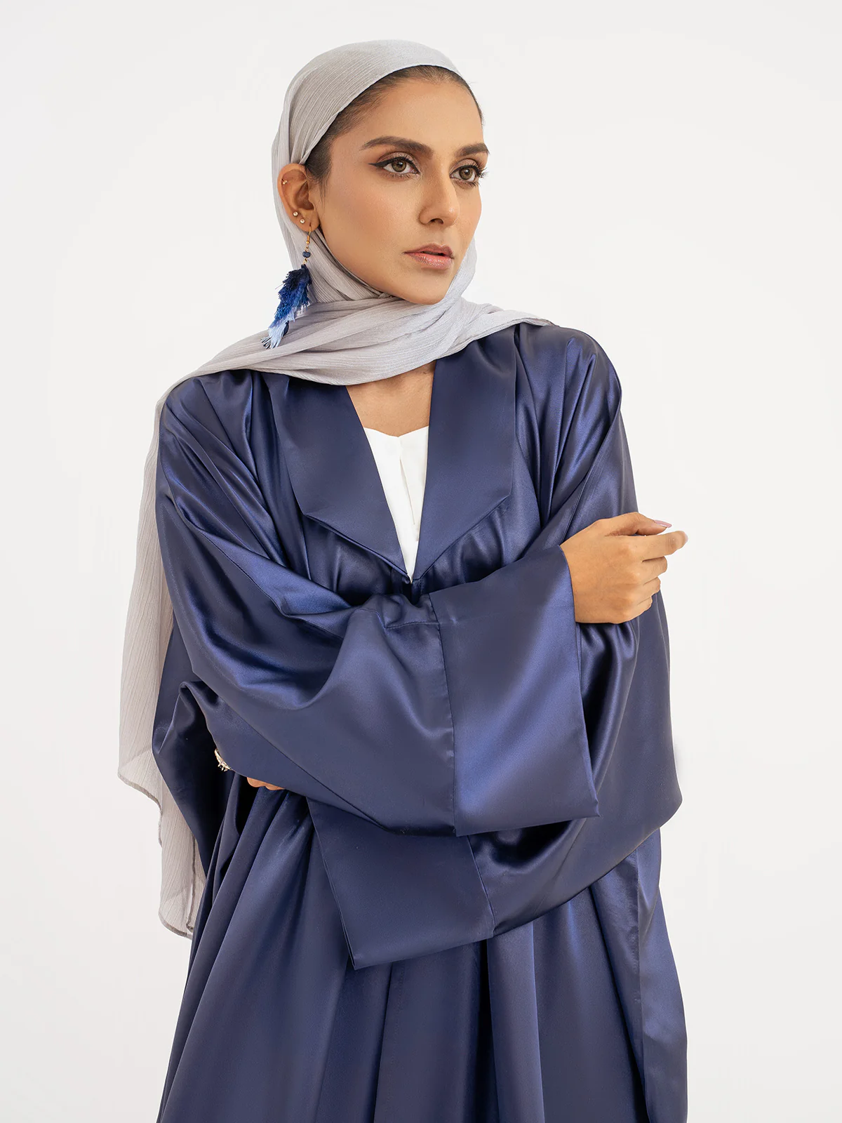 Marine Abaya is finely tailored in Satin Silk fabric and features a coat-style wide collar with baggy sleeves and front open design. It comes in Navy Blue color with an ideal subtle shine to uplift your look on any special event! The loose straight cut of this Abaya makes it appear formal while the smooth glimmer of silk fabric makes it look ideal for evening outs and special occasions.